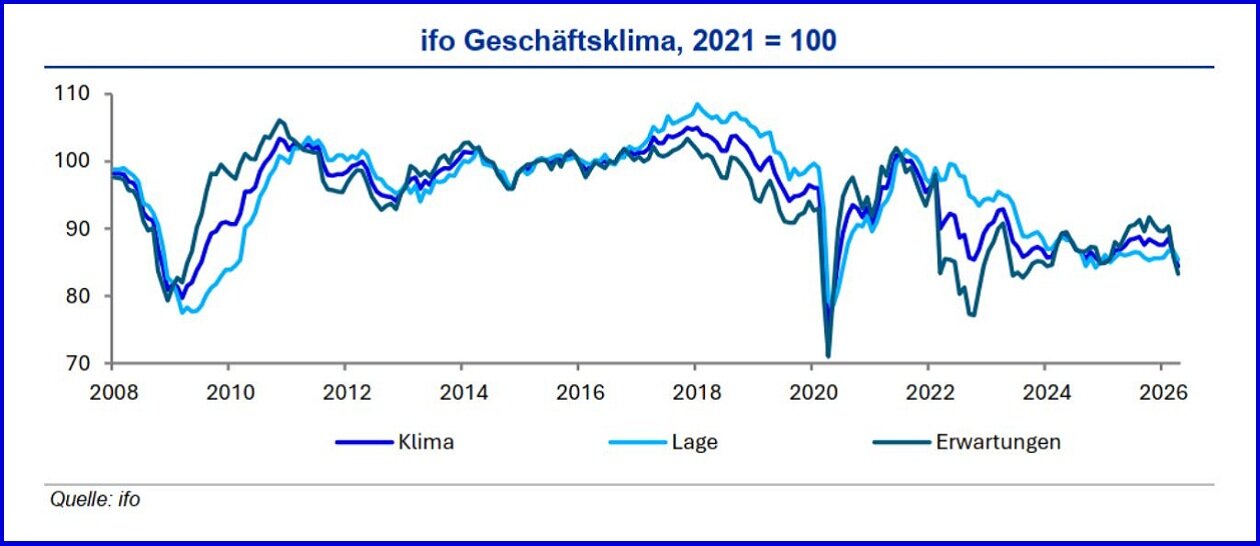 Das ifo Geschäftsklima hat sich nach dem März-Rückgang im April nochmals klar um fast zwei Punkte verschlechtert. Die Unternehmen beurteilten sowohl ihre Lage als auch die Geschäftsaussichten negativer. Insbesondere die Aussichten für die nächsten sechs Monaten fallen nochmals deutlich pessimistischer aus als im Vormonat. Die langsame Stimmungsaufhellung vor dem Irankonflikt ist somit zunichtegemacht. Das Vorhaben, durch weitreichende Weichenstellungen und Reformen die Wirtschaft und das Investitionsaktivitäten resilienter gegenüber externen Schocks zu machen, trägt bis dato keine Früchte.