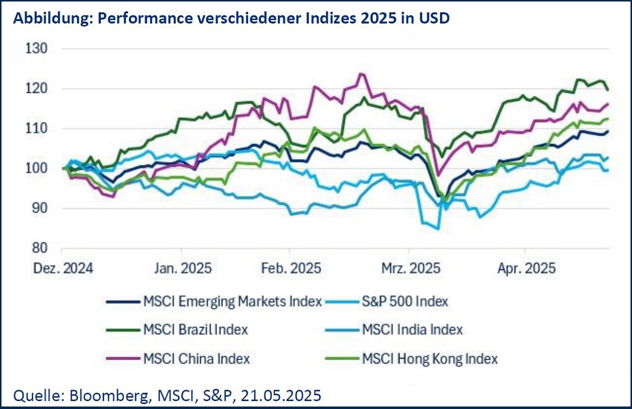 2025 fällt der Unterschied noch deutlicher aus. Bis zum 21. Mai verzeichneten US-Aktien – gemessen am S&P 500 – ein leichtes Minus, während Schwellenländerpapiere um rund 10 Prozent zulegten. Chinesische Aktien stiegen sogar um 17 Prozent (jeweils in US-Dollar). Grund dafür dürfte auch sein, dass die Schwellenländer Nachfrageschocks durch Stimulusmaßnahmen sehr viel einfacher abfedern können als die Vereinigten Staaten Angebotsschocks. Die Abmilderung zweiterer erfordert neue Fabriken, ausreichend Arbeitskräfte und letztlich auch sehr viel mehr Zeit. Insbesondere Zeit hatte Donald Trump nicht.