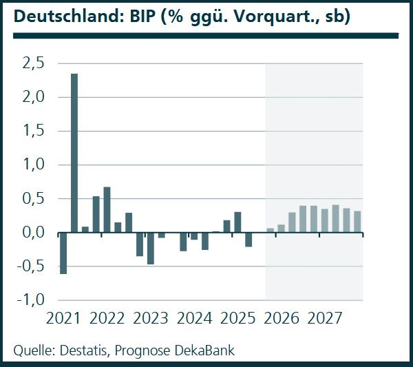 Es kehrt Ernüchterung ein. Nach einer Hoffnungswelle im Sommerhalbjahr beginnen die Stimmungsindikatoren wieder nach unten zu drehen. Es ist eine Mischung aus enttäuschten Hoffnungen auf Reformen und schwächeren Konjunkturnachrichten. So kommt der Konsum angesichts vieler Negativmeldungen zum Beschäftigungsabbau und wegen des hohen Preisniveaus nicht in Fahrt. Das Weihnachtsgeschäft dürfte hinter den Erwartungen bleiben. Insgesamt ist im Schlussquartal alles, was mehr als Stagnation ist, schon ein Erfolg. Im kommenden Jahr ist dank eines positiven Arbeitstageeffekts und der Schubwirkung der Sondervermögen ein gesamtwirtschaftliches Wachstum von immerhin wiede r0,9 Prozent erreichbar