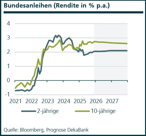 Die Marktteilnehmer sehen nur noch eine kleine Restwahrscheinlichkeit dafür, dass die EZB die Leitzinsen weiter senken wird. Dieser Zustand sollte bis auf Weiteres bestehen bleiben und einem deutlichen Anstieg der Renditen kurzlaufender Bundesanleihen entgegenwirken. Das lange Ende wird belastet durch die Ausgabenpläne der Bundesregierung sowie die möglicherweise abnehmende Nachfrage niederländischer Pensionskassen nach Staatsanleihen mit sehr langen Laufzeiten. Dennoch stößt die Steilheit der Bundkurve an ihre Grenzen, denn unter der Prämisse, dass das kurze Ende fest verankert bleibt, erzielen langlaufende Bundesanleihen einen signifikanten Mehrertrag. Bei stabilen Inflations- und Leitzinserwartungen sollte der immer noch hohe Anlagebedarf daher mit der Zeit zu einem leichten Rückgang der Renditen am langen Ende führen.