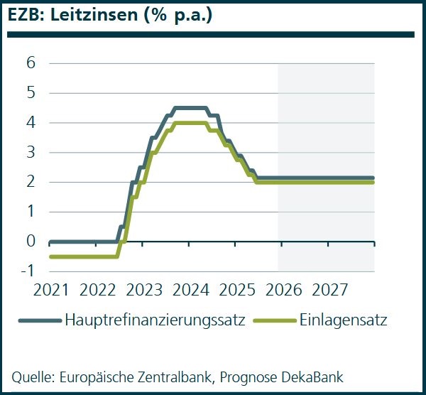 mehr Aufschluss geben, wie hoch die Hürden für einen weiteren Zinsschritt sind. Während die Verschiebung der zweiten Stufe des Emissionshandels ETS2 einen dämpfenden Effekt auf die Inflationsraten ab 2027 haben dürfte, rechnen wir mit einer leichten Aufwärtsrevision beim vorhergesagten Pfad der Kerninflation. In der Summe könnte sich eine Unterschreitung des Inflationsziels ergeben, die zwar einige Zeit andauert, im Ausmaß aber nicht groß ist. Die meisten Mitglieder des EZB-Rats dürften bereit sein, eine solche Entwicklung bei unveränderten Leitzinsen zu tolerieren. Dennoch werden sie sich auch bei der bevorstehenden Sitzung eine Hintertür für eventuelle weitere Senkungen offen halten. Sie dürften darin jedoch lediglich eine Option für den Fall sehen, dass sich das wirtschaftliche Umfeld unerwartet verschlechtert.