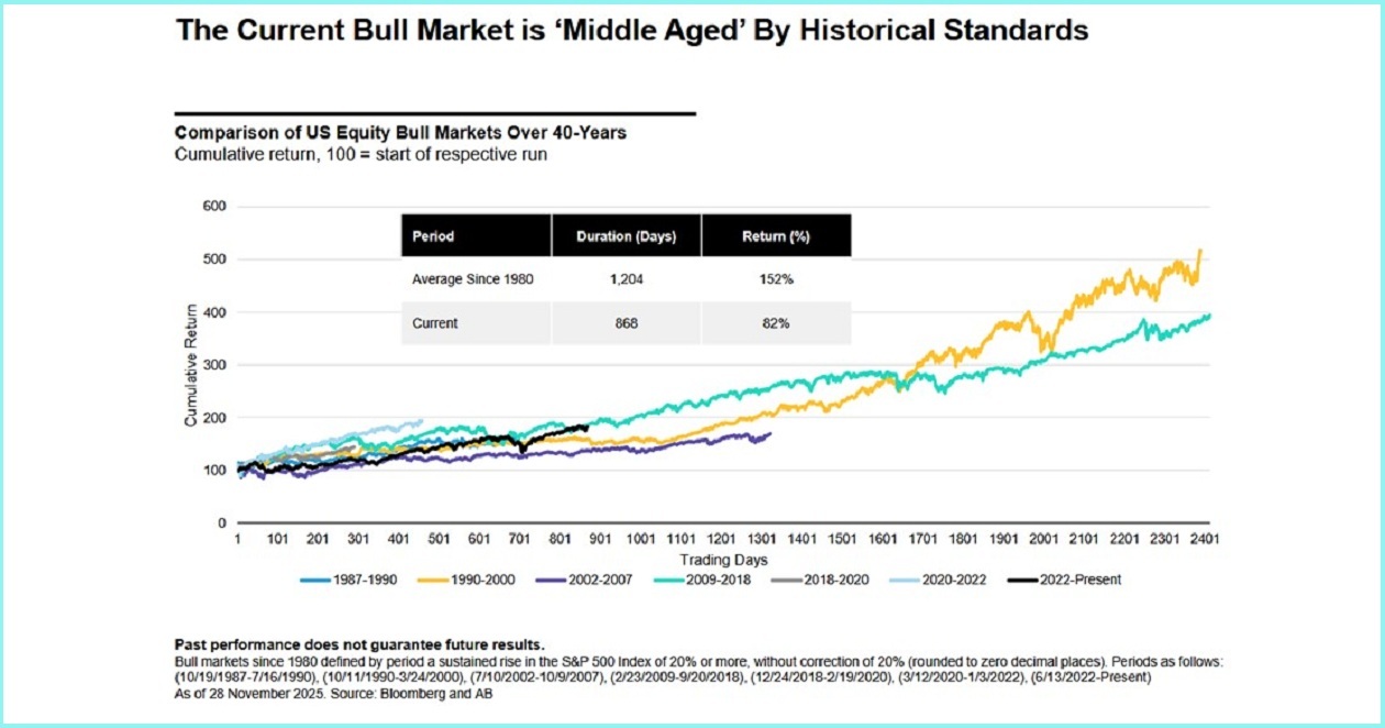 Die globale Aktienrally, die nach dem Abschwung Ende 2022 einsetzte, hat starke Gewinne erzielt. Entsprechend stellt sich die Frage, ob dieser Bullenmarkt seinem Ende entgegengeht. Historisch betrachtet ist das unwahrscheinlich: Bullenmärkte sterben selten „an Altersschwäche“ – sie enden meist durch externe Schocks oder Übertreibungen. Im historischen Vergleich wirkt die aktuelle Rally eher „mittelalt“ und keineswegs extrem. Auch das Marktumfeld erscheint insgesamt unterstützend: Für 2026 erwarten wir ein Wachstum nahe dem Trend, und auch die US-Notenbank verfügt über ausreichend Spielraum, die Zinsen falls notwendig weiter zu senken. Ausstiegsszenarien wirken daher verfrüht. Gleichzeitig gewinnt selektives Vorgehen an Bedeutung, um Gewinner von Verlierern zu unterscheiden (Grafik1).