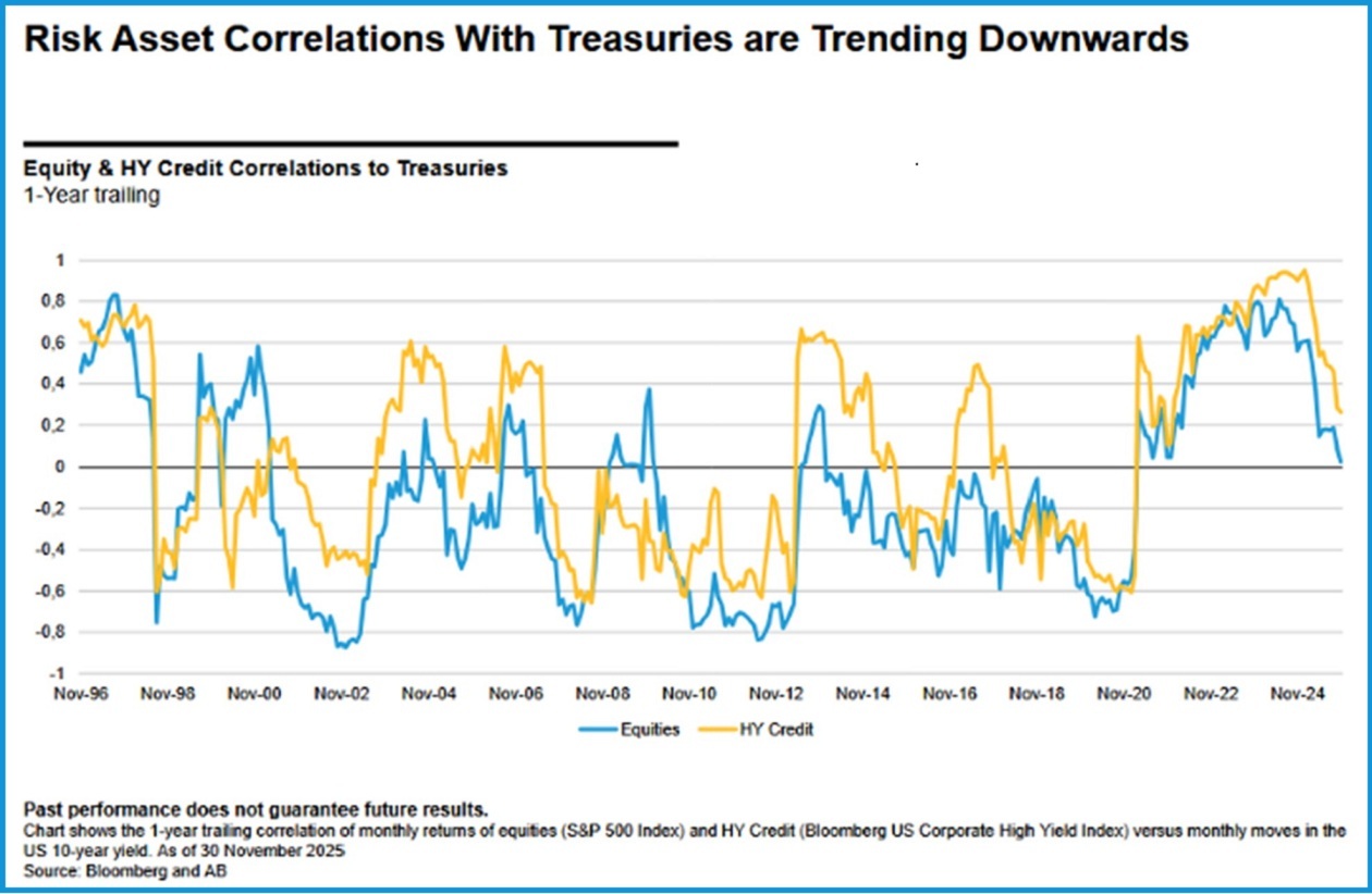 Im Aktienbereich bevorzugen wir die USA aufgrund hoher Profitabilität und robuster Bilanzen – dennoch bleibt Diversifikation entscheidend. Schwellenländer bieten attraktive Bewertungen, profitieren von sinkenden lokalen Zinsen und einem schwächeren Dollar und eröffnen alternative KI-Exposure-Pfade, insbesondere in China, Taiwan und Südkorea. Ergänzend können defensive Strategien wie Low-Volatility-Aktien Stabilität in volatileren Phasen bieten. Auf der Anleiheseite erhöhen wir den Fokus auf Qualität. Investment-Grade-Unternehmensanleihen und BB-geratete Titel bleiben bevorzugte Renditequellen. Das moderatere Wachstum spricht für Vorsicht bei niedrigeren Qualitätssegmenten. Staatsanleihen haben ihre negative Korrelation zu Risikoanlagen wiedererlangt und bieten Schutz bei Turbulenzen – kurze bis mittlere Laufzeiten sind hier besonders attraktiv, da sie vom Zinssenkungszyklus der Fed profitieren könnten, während das lange Ende durch fiskalische Risiken belastet bleibt.