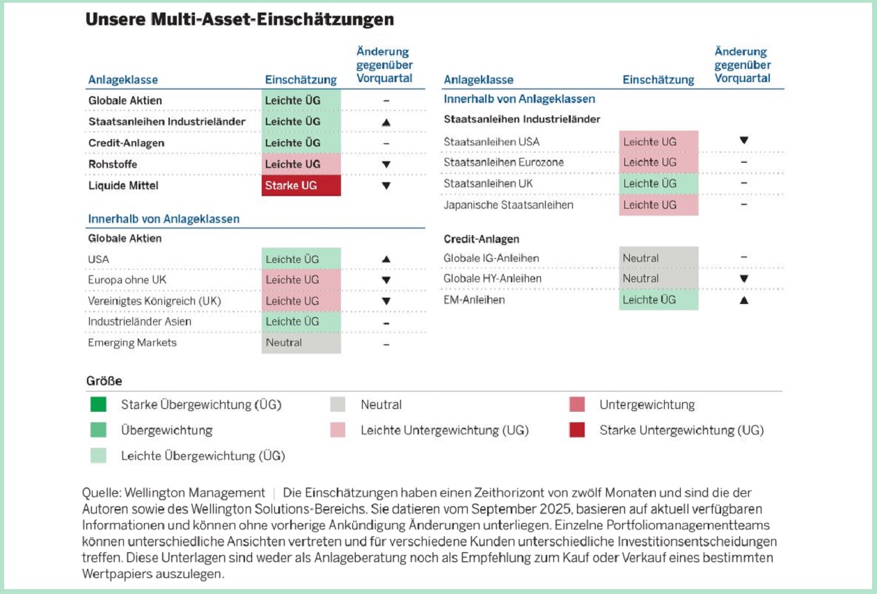 Wir befürworten nach wie vor eine leichte Übergewichtung globaler Aktien. Die Gewinne entwickeln sich weltweit solide, und die politischen Rahmenbedingungen sind günstig. Obwohl noch Fragen zu den US-Zöllen offen sind, scheint ein Großteil der Unsicherheit inzwischen hinter uns zu liegen. Wir stehen KI weiterhin positiv gegenüber. Die massiven Investitionen sorgen kurzfristig für einen konjunkturellen Aufschwung und könnten langfristig zu noch bedeutenderen Produktivitätssteigerungen führen.