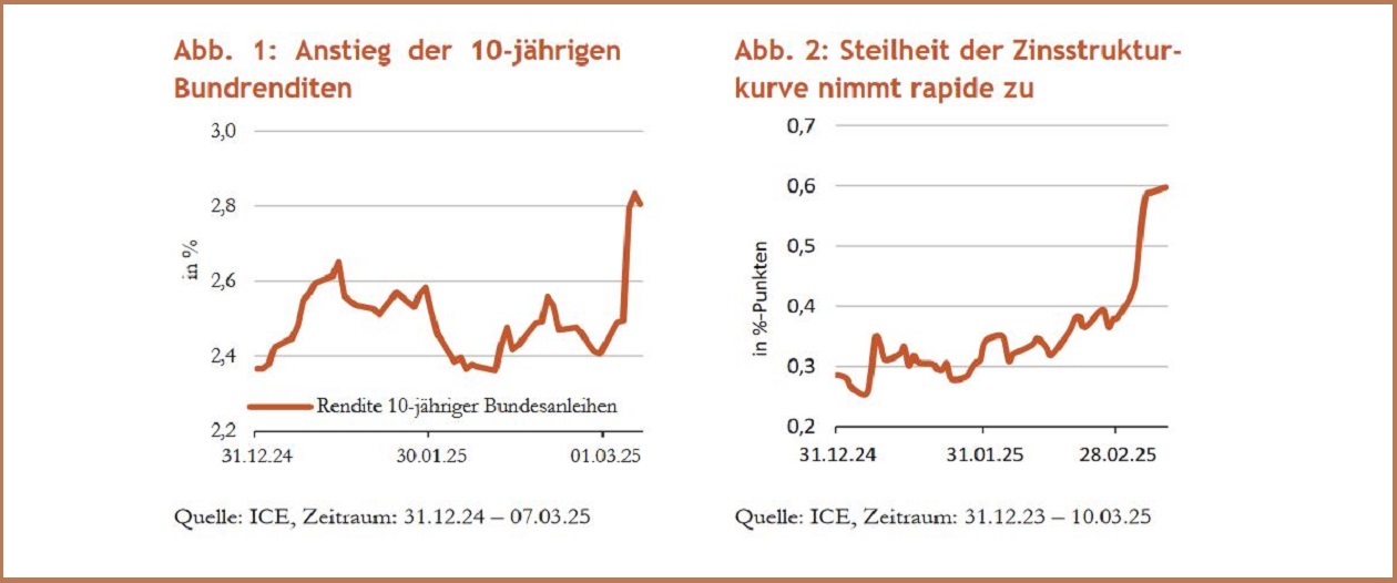 Für die Beurteilung der Auswirkungen des Fiskalpaketes auf die Rentenmarktentwicklung müssen verschiedene Zeithorizonte betrachten werden. Kurzfristig haben die Kapitalmärkte bereits einen Niveausprung eingepreist. Auch unsere Volkswirte haben ihre Prognosen für die 10-jährige Bundrendite nach oben revidiert und sehen diese jetzt bei 2,8 Prozent per Jahresende. Mittel- bis langfristig sollten die oben skizzierten Effekte für ein höheres Wachstum und perspektivisch auch für steigende Inflation sorgen. Dies könnte dazu führen, dass höhere Bundrenditen und eine steilere Zinsstrukturkurve auch längerfristig gerechtfertigt sind. Gegenwärtig stehen Bundrenditen jedoch im Spannungsfeld zwischen den zunehmenden geopolitischen Spannungen, potenziellen negativen kurzfristigen konjunkturellen Entwicklungen und zunehmendem Konjunkturoptimismus aufgrund der erwarteten fiskalischen Maßnahmen.