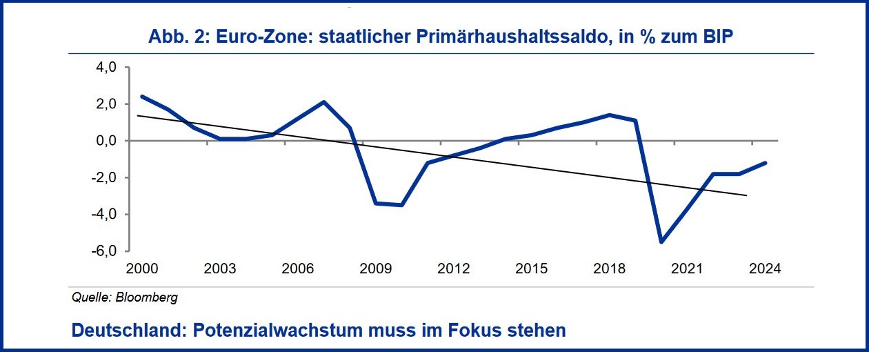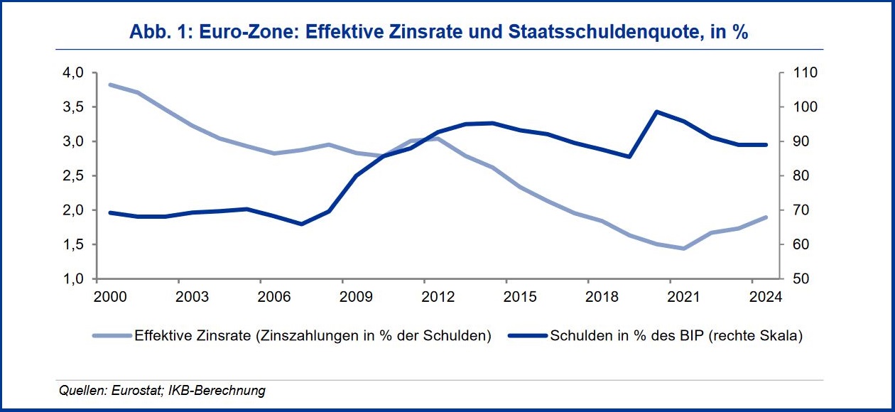 Mit einem BIP-Wachstum von nur 3 Prozent wird deshalb früher oder später ein fiskalischer Kraftakt nötig sein, um die Schuldenquote zu kontrollieren. Die Primärbilanz der Euro-Zone lag jedoch bereits in den letzten Jahren im Minus und zeigt eine strukturelle Verschlechterung. Ein Trend, der in den kommenden Jahren angesichts steigender Verteidigungsausgaben und Druck auf die Sozialsysteme anhalten sollte. Es ist absehbar, die Schuldentragfähigkeit gerät mehr und mehr unter Druck, und auch die Euro-Zone wird in den kommenden Jahren eine Schuldenquote von 100 % ausweisen. Entscheidend ist dabei nicht die Schuldenquote oder ihr erwarteter Anstieg. Kritisch wird es, wenn die effektive Zinsrate höher als die BIP-Wachstumsrate ausfällt und sich ohne Primärüberschuss der Anstieg der Schuldenquote verselbstständigt.