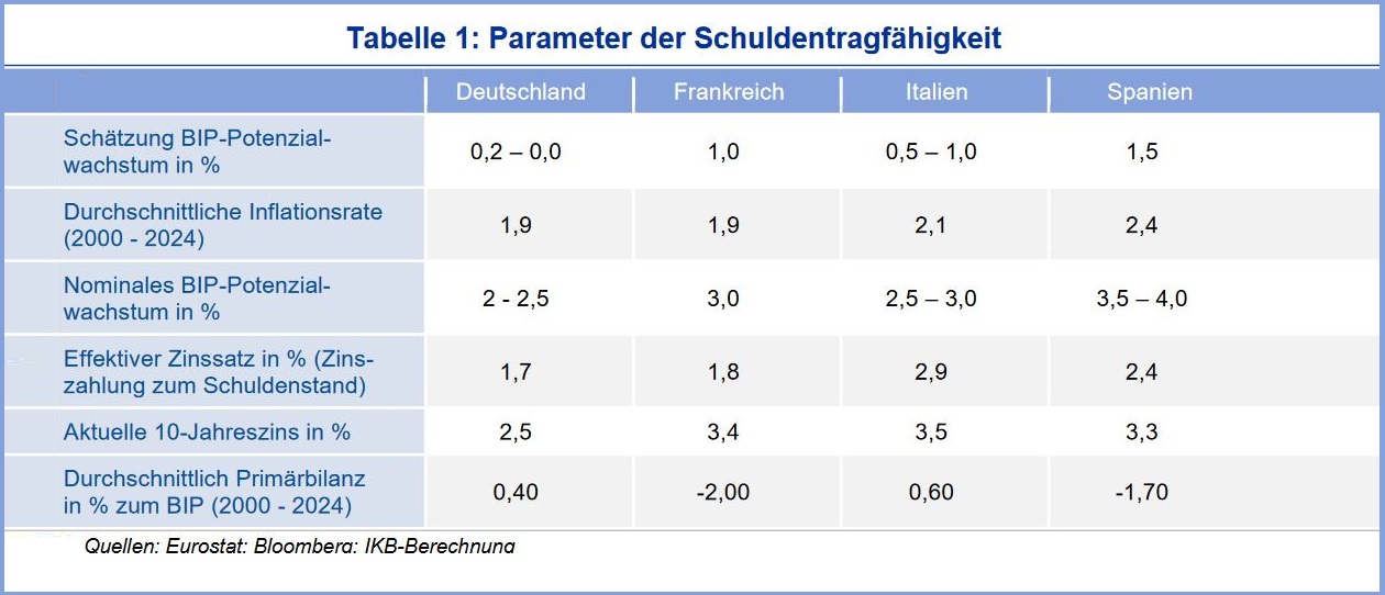 Außer in den Corona-Jahren hat Italien immer einen Primärüberschuss erzielt. Dies gilt auch für 2024 und ist angesichts des niedrigen Wachstums notwendig, um die Schuldenquote zu stabilisieren. Im Gegensatz dazu ist die französische Schuldenquote deutlich dynamischer angestiegen, was an einem chronischen Primärdefizit liegt. Im Jahr 2024 war die Primärbilanz mit fast 4 Prozent des BIP im Defizit. Auch Spaniens Primärbilanz ist im Schnitt negativ, betrug jedoch nur 1 Prozent im Jahr 2024. Tabelle 1 gibt einen Überblick über entscheidende Parameter der Schuldentragfähigkeit der vier größten Euro-Länder.