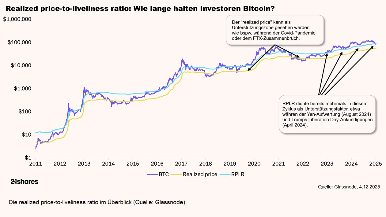 Ein zweiter wichtiger Indikator ist die „realized price-to-liveliness ratio“ (RPLR). Sie gibt Aufschluss darüber, wie lange Bitcoin von ihren Besitzern tatsächlich gehalten werden, indem sie die durchschnittlichen Einstandspreise mit der Aktivität auf der Blockchain vergleicht. Auffällig ist: Ein großer Teil des Bestands wird seit Jahren nicht bewegt, was auf eine stabile Basis langfristiger Halter schließen lässt. Auch die stark gestiegene aggregierte Kostenbasis – unter anderem durch große Kapitalzuflüsse über ETFs – deutet darauf hin, dass Bitcoin zunehmend nicht spekulativ, sondern mit langfristigem Anspruch gehalten wird. Beide Kennzahlen verraten nicht direkt, was der „wahre“ Wert von Bitcoin ist, geben aber durchaus Einblick über dessen Sicherheit und heutige Nutzung.