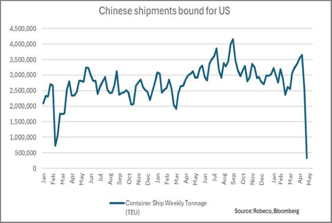 Die Daten aus Verbraucher- und Produzentenumfragen sind schwach, obwohl die tatsächlichen Ausgaben- und Arbeitsmarktdaten noch nicht leiden. Es gibt Anhaltspunkte dafür, dass US-Konsumenten ihre Ausgaben vorziehen und Unternehmen vor Inkrafttreten der Zölle ihre Lagerbestände erhöht haben. Infolge der Zölle sind die Versandmengen aus China drastisch gesunken. Die jüngsten Parallelen lassen sich zum Angebotsschock während der Corona-Krise im Jahr 2020 ziehen, als Güter knapp wurden und die Inflation in die Höhe schoss.