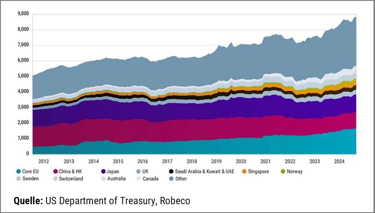 Die größten Auswirkungen dürften sich bei US-Staatsanleihen zeigen, von denen ein Volumen von 9 Billionen US-Dollar im Besitz ausländischer Anleger, darunter China, ist. Skeptische Anleiheninvestoren (die sogenannten Bond Vigilantes) haben sie auf den Markt geworfen, was die Renditen in die Höhe trieb und Kurse einbrechen ließ.